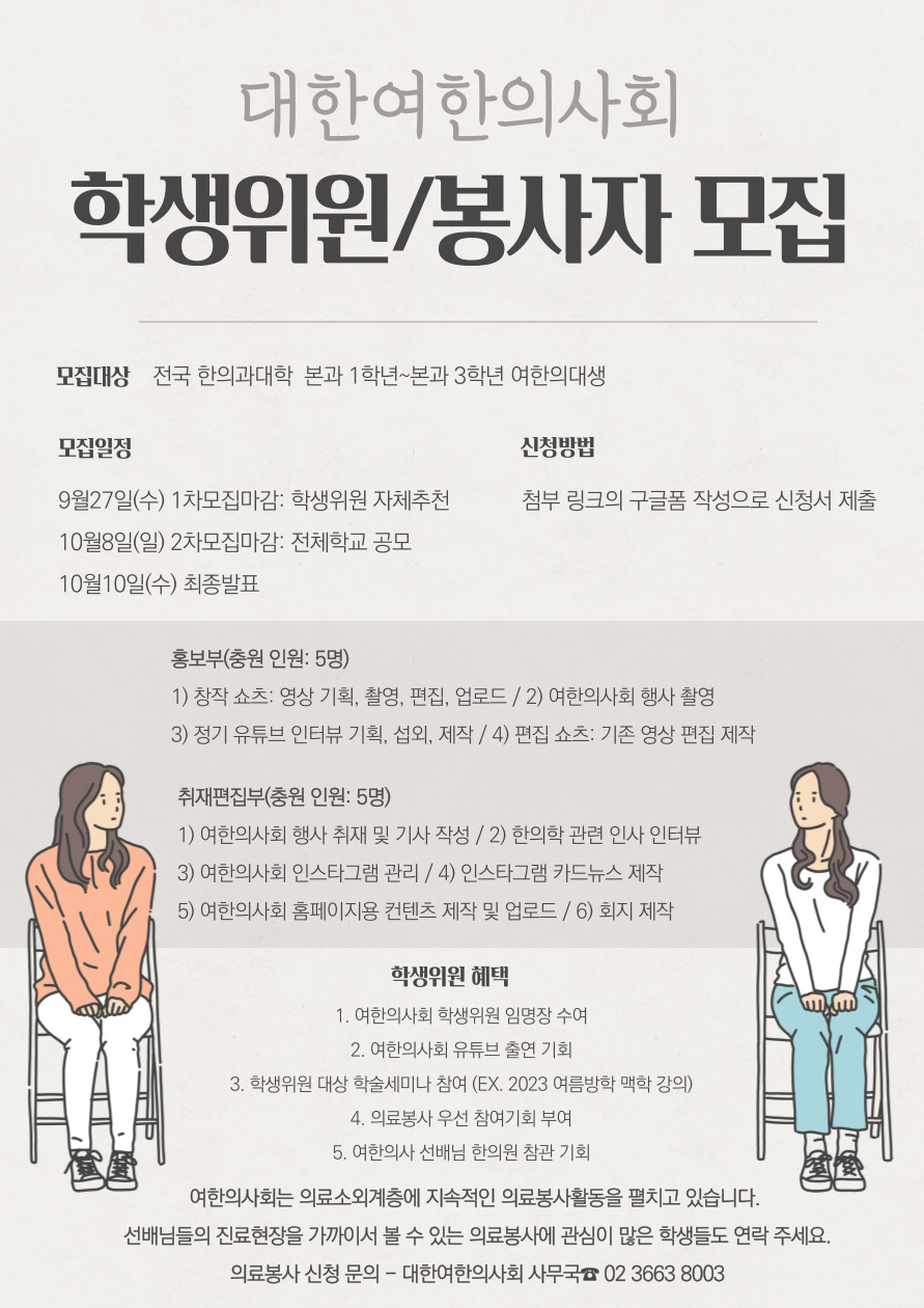단, 모든 게 처음이어도 열정만 있다면 두 팔 벌려 환영합니다. * 학생위원 혜택 * 1. 여한의사회 학생위원 임명장 수여 2. 여한의사회 유튜브 출연 기회 3. 방학 중 학생위원 대상의 학술세미나 예정 (EX. 2023 여름방학 맥학 강의 진행) 4. 의료봉사 우선 참여기회 부여 5. 여한의사 선배님 한의원 참관 기회