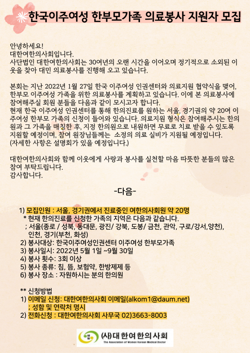 ![]() 한국이주여성 한부모가족 의료봉사 지원자 모집 많은 관심과 지원 바랍니다.. |