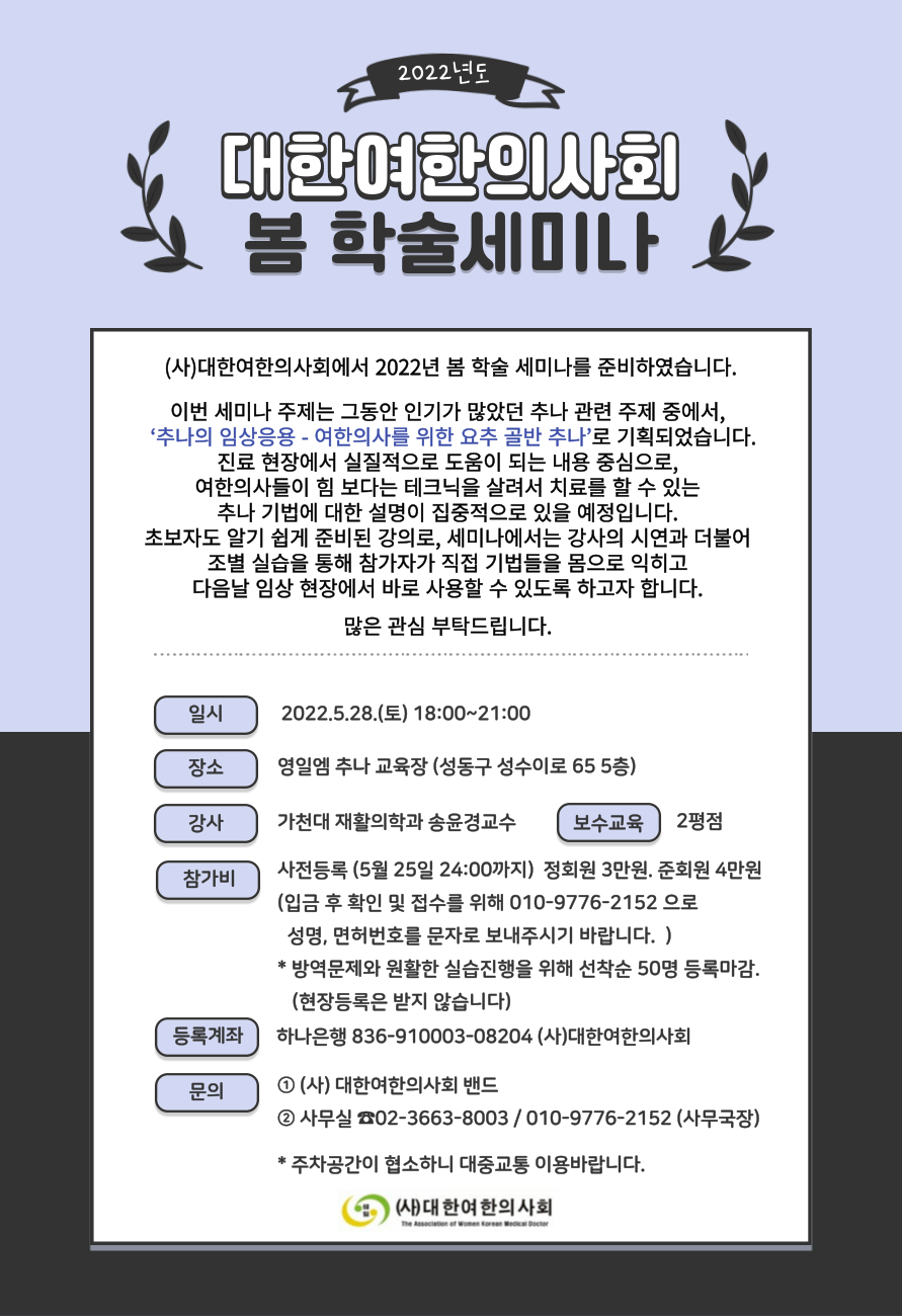 본문 제목 2022 봄 학술 세미나를 개최합니다 작성자 관리자 조회수 3,947 날짜 2022-05-12 많은 참여 부탁드립니다. 목록 이전글2022 진로멘토링 '여한의사 선후배들의 만남' 2022.06.13 다음글2022년 대한여한의사회 ‘미래인재상’ 수상후보자 추천 공고 2022.05.09 댓글목록 댓글목록 등록된 댓글이 없습니다.