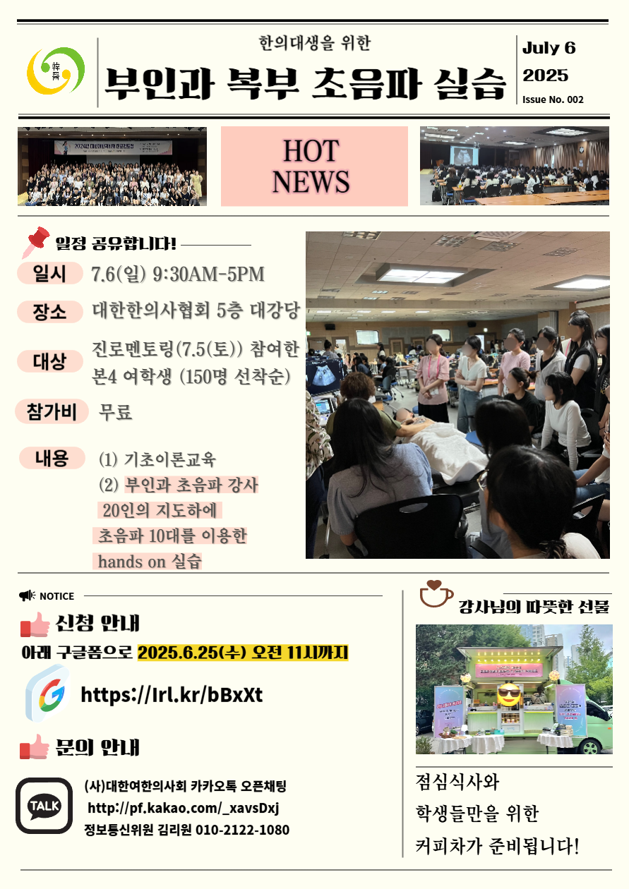 ![]() 2025 대한여한의사회 초음파 실습 강의 " 한의대생을 위한 부인과 복부 초음파 기초 실습 " - 일시: 2025. 7. 6 (일) 9:30AM-5PM - 장소: 대한한의사협회 5층 대강당 - 대상: 진로멘토링(7.5(토)) 참여한 본4 여학생 (150명 선착순) - 문의: (사)대한여한의사회 카카오톡 오픈채팅 - 참가비 : 무료 - 내용 (1) 기초이론교육 (2) 부인과 초음파 강사 20인의 지도하에 초음파 10대를 이용한 hands on 실습 |