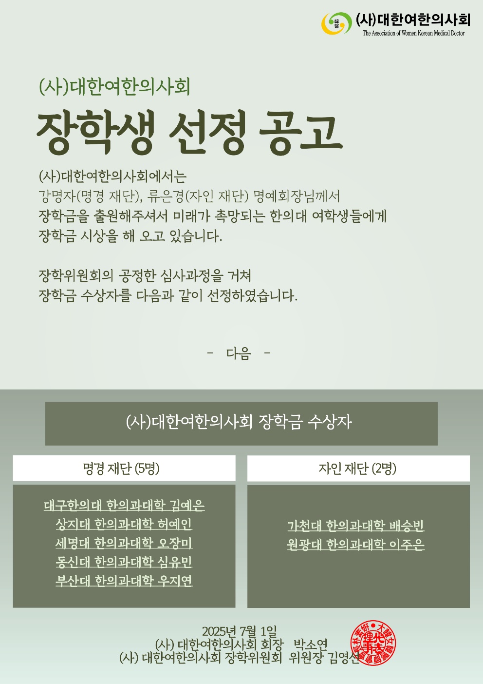 본문 제목 2025 상반기 장학생 선정결과 공고 작성자 관리자 조회수 2,990 날짜 2025-07-01 .. 목록 이전글트라우마 한의 일차진료 전문과정 교육프로그램 공고 2025.08.11 다음글2025 대한여한의사회 융합인재상 선정 공고 2025.07.01 댓글목록 댓글목록 등록된 댓글이 없습니다.