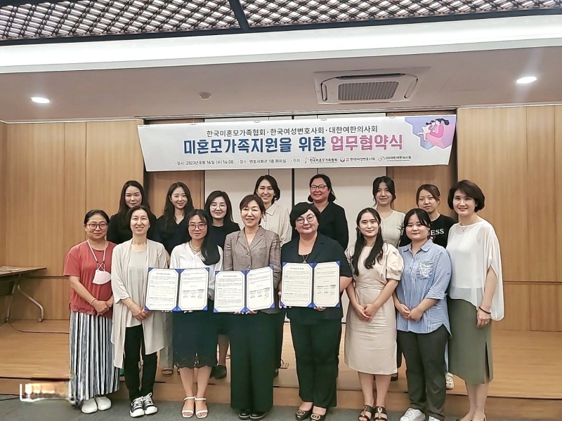 일시 : 2023. 08. 16 (수) 오후 2시 장소 : 서초동 변호사회관 1층 회의실 (사)대한여한의사회(회장 박소연)와 한국여성변호사회(회장 김학자), (사)한국미혼모가족협회(회장 김민정)는 ‘미혼모 가족 지원을 위한 업무협약’을 체결했다.