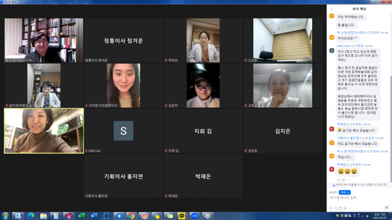 13차 정기이사회가 의료봉사, EBC 여의보감 진행, 한국여성변호사협회와 협업 진행 건 등 활발한 논의가 이루어졌던 시간이었습니다.^^ |